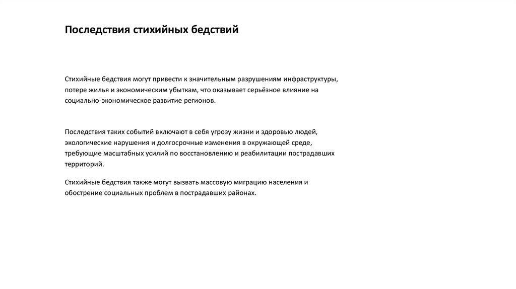 Последствия стихийных бедствийСтихийные бедствия могут привести к значительным разрушениям инфраструктуры,