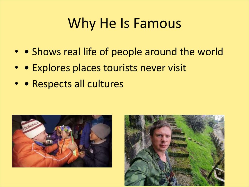 Why He Is Famous• • Shows real life of people around the world