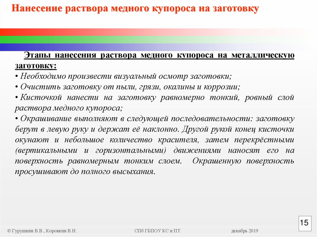 Нанесение раствора медного купороса на заготовкуЭтапы нанесения раствора медного купороса на металлическую