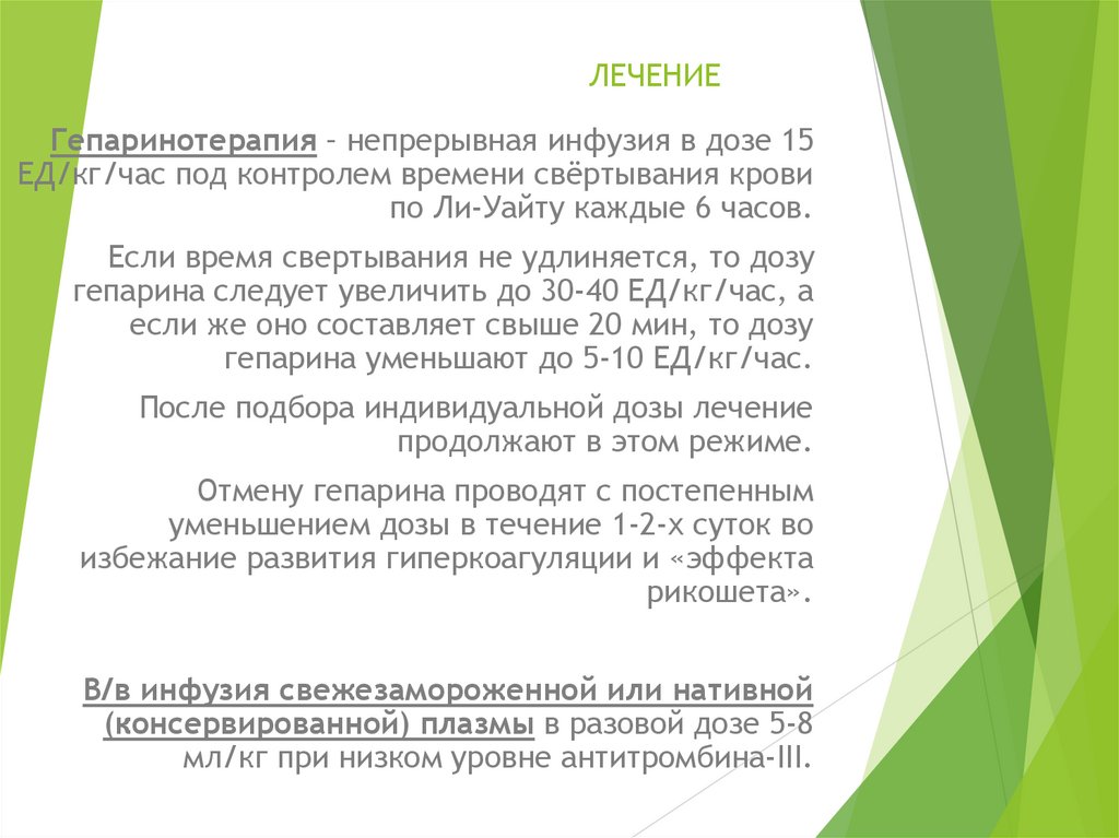ЛЕЧЕНИЕГепаринотерапия – непрерывная инфузия в дозе 15
