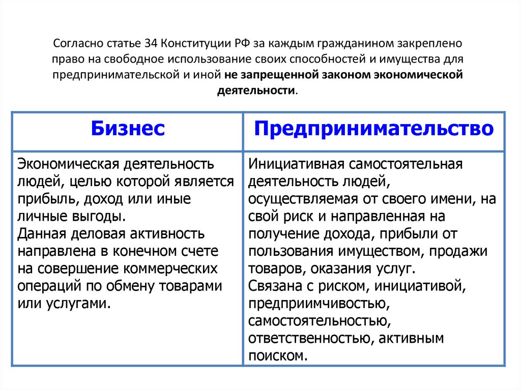Согласно статье 34 Конституции РФ за каждым гражданином закрепленоправо на свободное использование своих способностей и имущества для