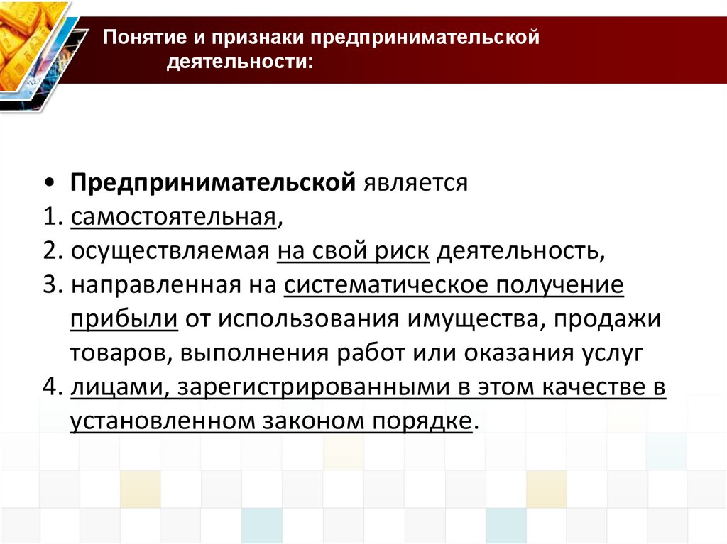 Понятие и признаки предпринимательскойдеятельности:
