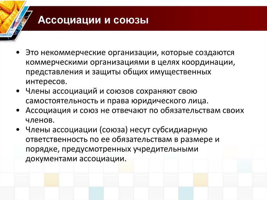 • Ассоциация и союз не отвечают по обязательствам своих