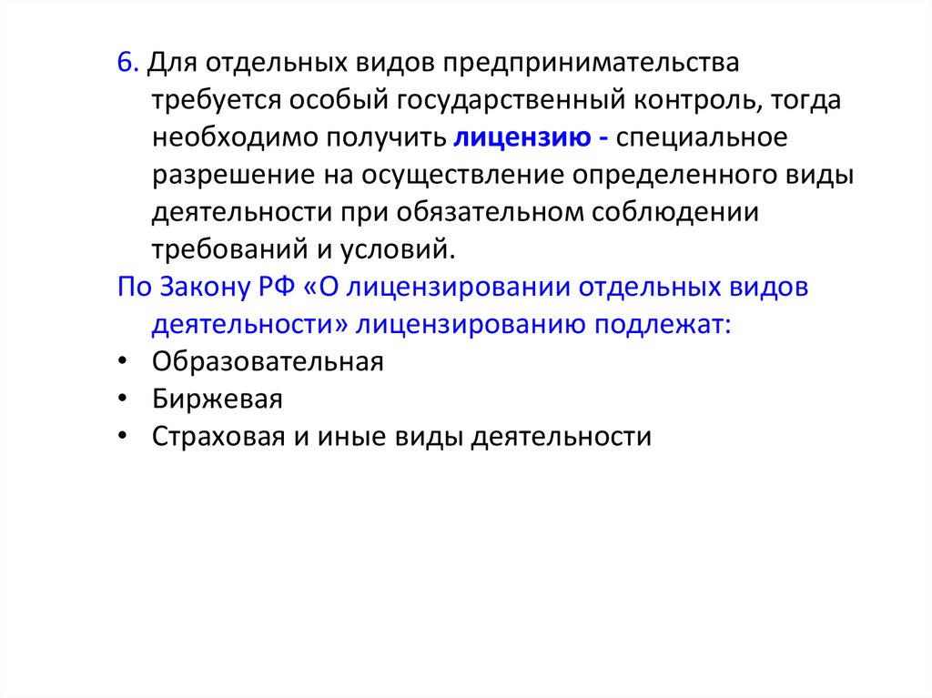 6. Для отдельных видов предпринимательстватребуется особый государственный контроль, тогда