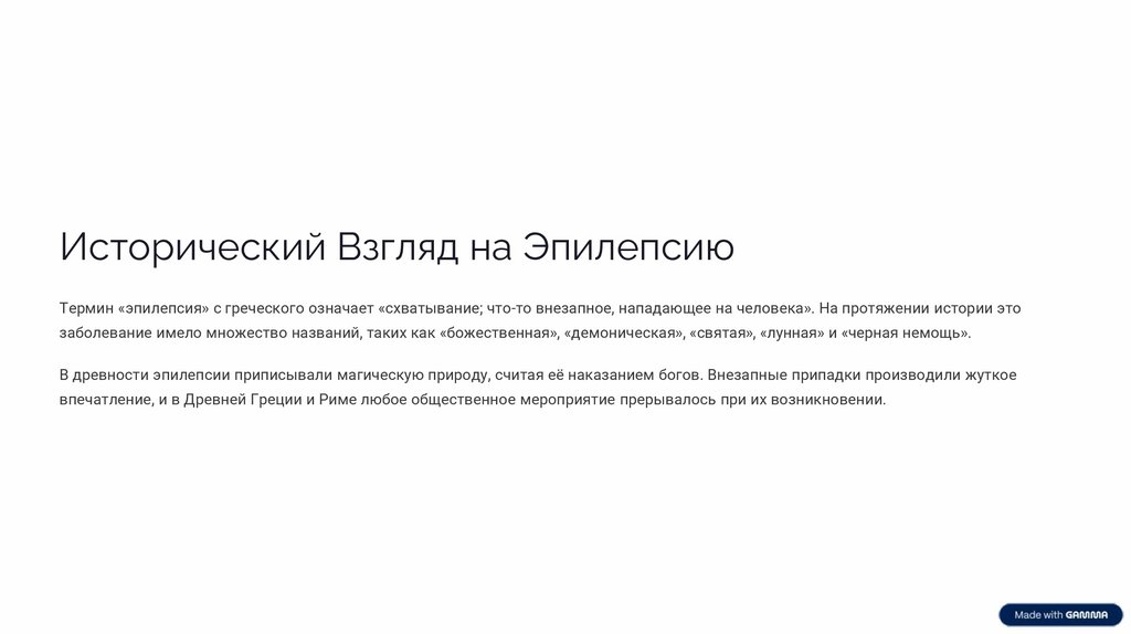 Исторический Взгляд на ЭпилепсиюТермин «эпилепсия» с греческого означает «схватывание; что-то внезапное, нападающее на человека». На протяжении истории это