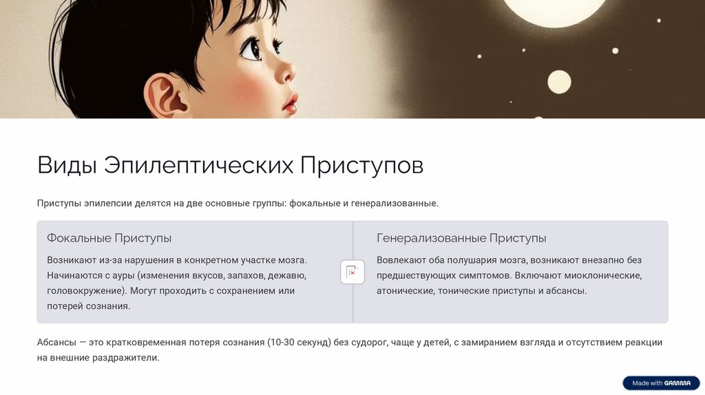 Абсансы — это кратковременная потеря сознания (10-30 секунд) без судорог, чаще у детей, с замиранием взгляда и отсутствием реакции
