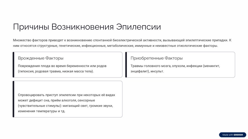 Причины Возникновения ЭпилепсииМножество факторов приводят к возникновению спонтанной биоэлектрической активности, вызывающей эпилептические припадки. К