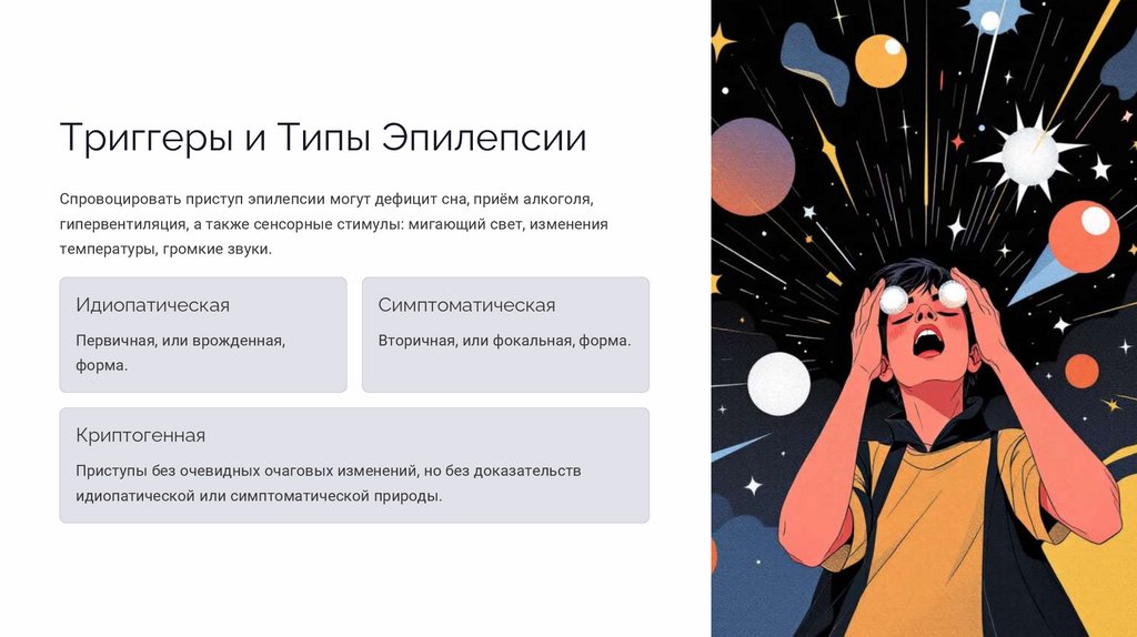 Триггеры и Типы ЭпилепсииСпровоцировать приступ эпилепсии могут дефицит сна, приём алкоголя,