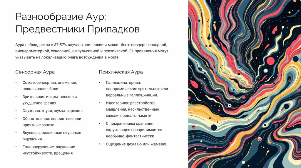 Аура наблюдается в 37-57% случаев эпилепсии и может быть висцеросенсорной,