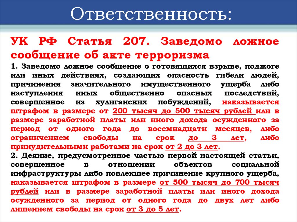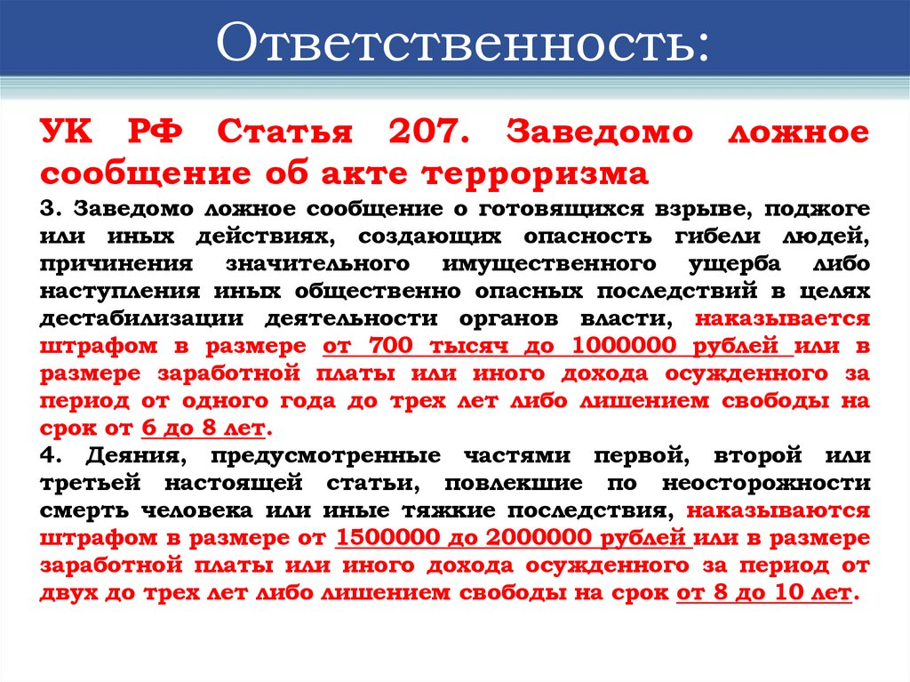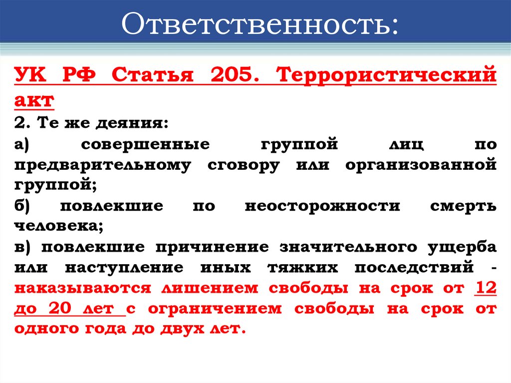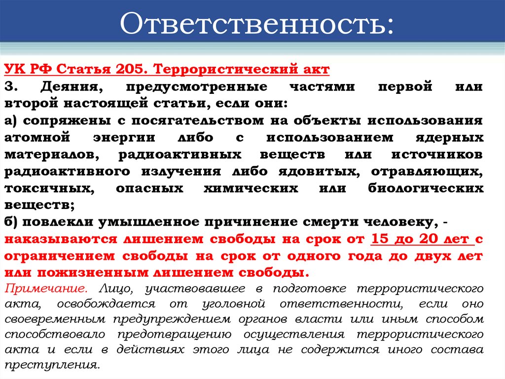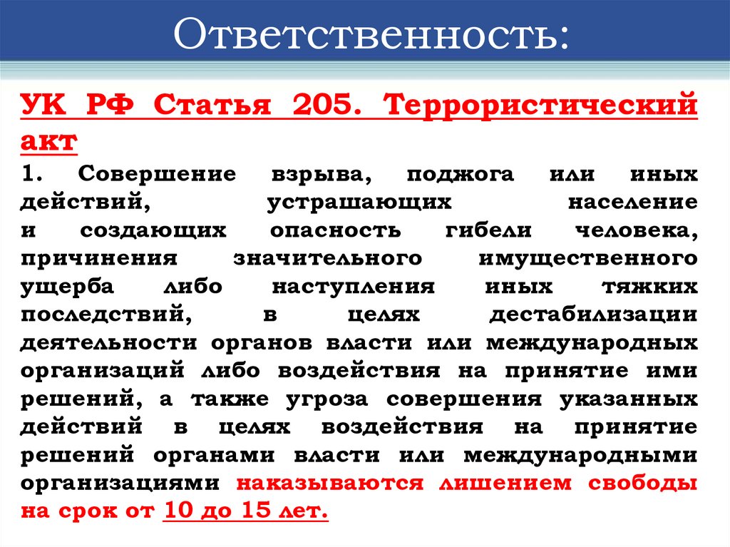 Ответственность:УК РФ Статья 205. Террористический
