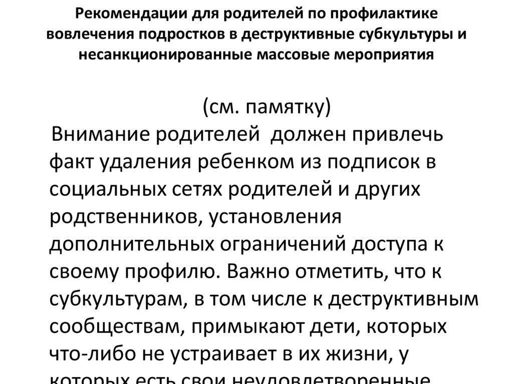 Рекомендации для родителей по профилактикевовлечения подростков в деструктивные субкультуры и