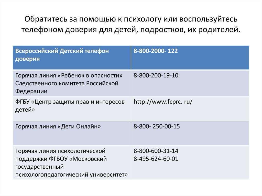 Обратитесь за помощью к психологу или воспользуйтесьтелефоном доверия для детей, подростков, их родителей.