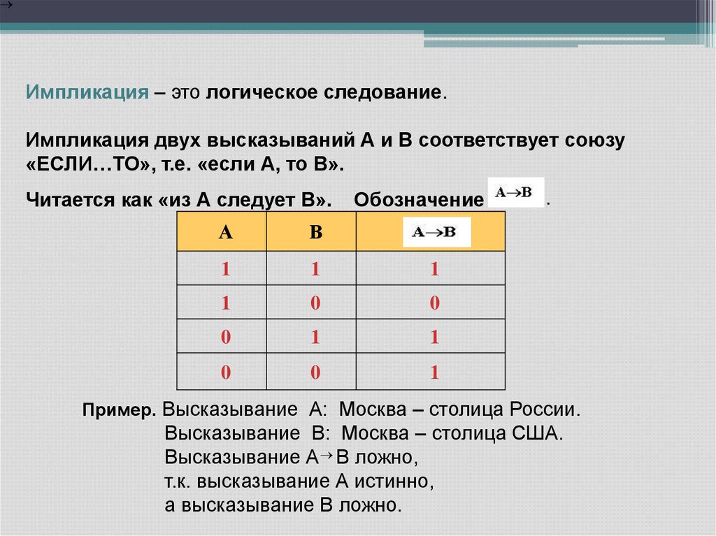 Импликация – это логическое следование.Импликация двух высказываний А и В соответствует союзу