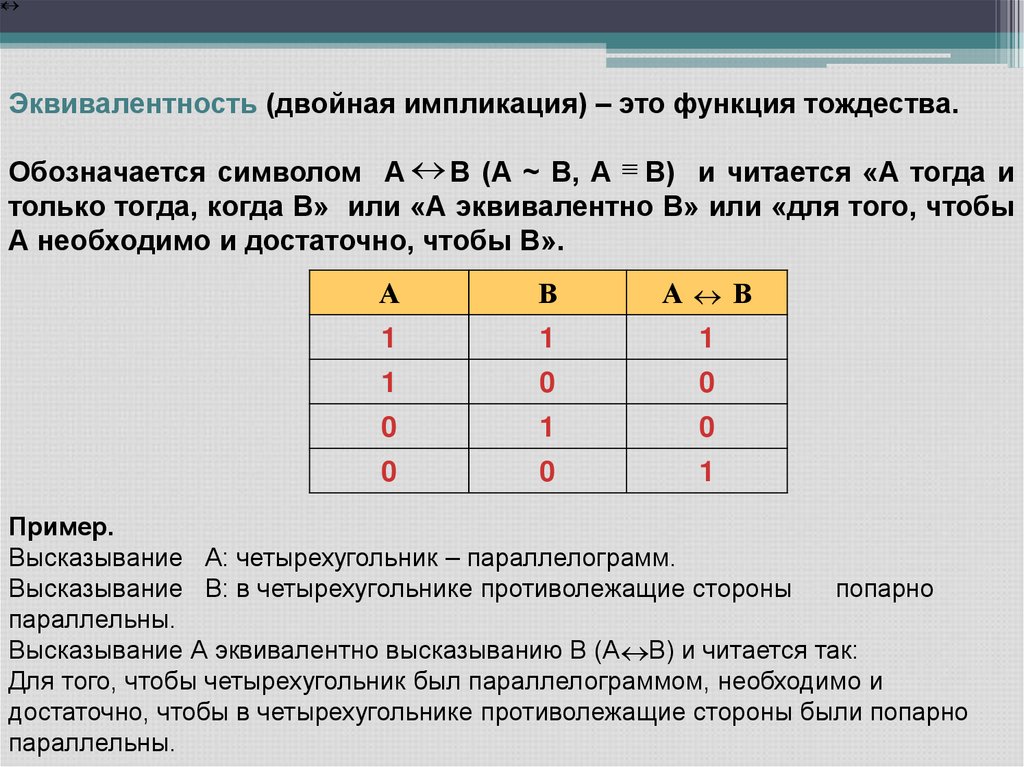 Эквивалентность (двойная импликация) – это функция тождества.Обозначается символом А В (А ~ В, А В) и читается «А тогда и