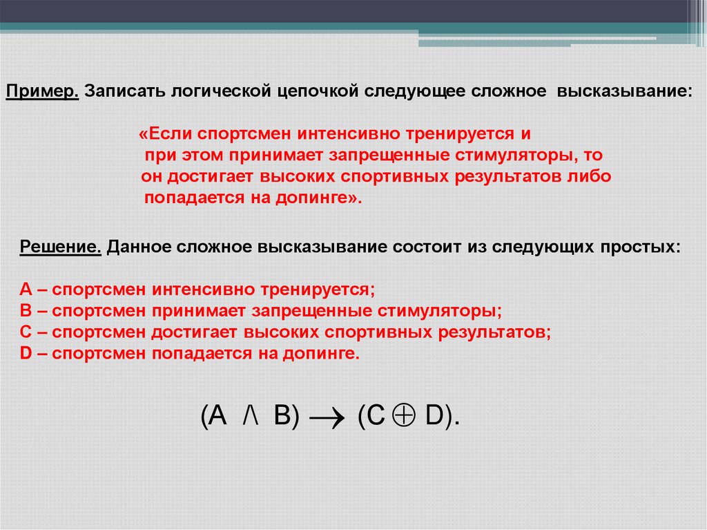 Пример. Записать логической цепочкой следующее сложное высказывание:«Если спортсмен интенсивно тренируется и