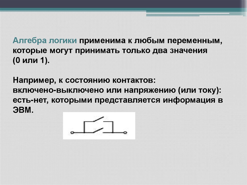 Алгебра логики применима к любым переменным,которые могут принимать только два значения