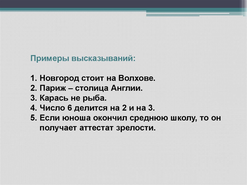 Примеры высказываний:1. Новгород стоит на Волхове.