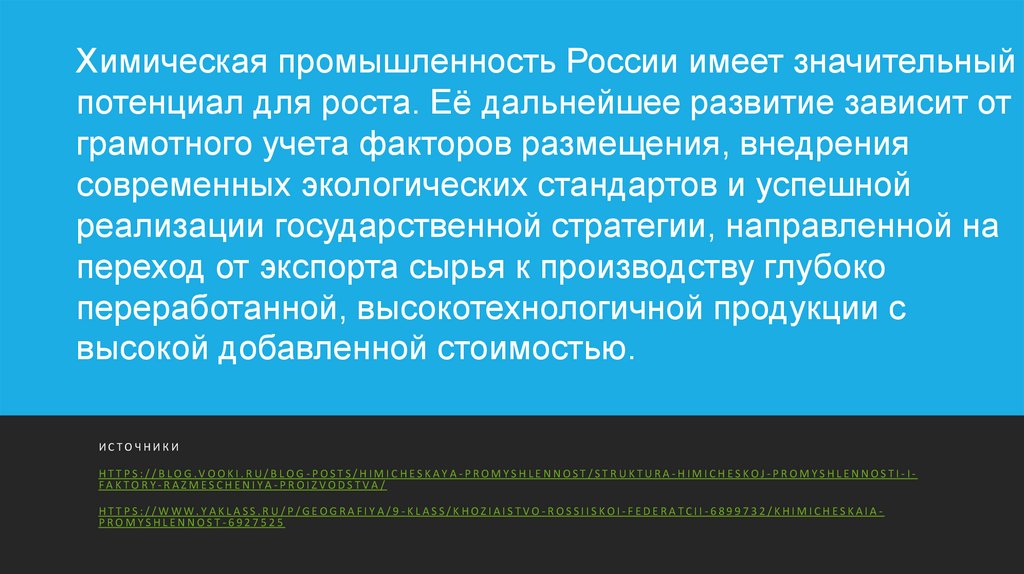 Химическая промышленность России имеет значительныйпотенциал для роста. Её дальнейшее развитие зависит от