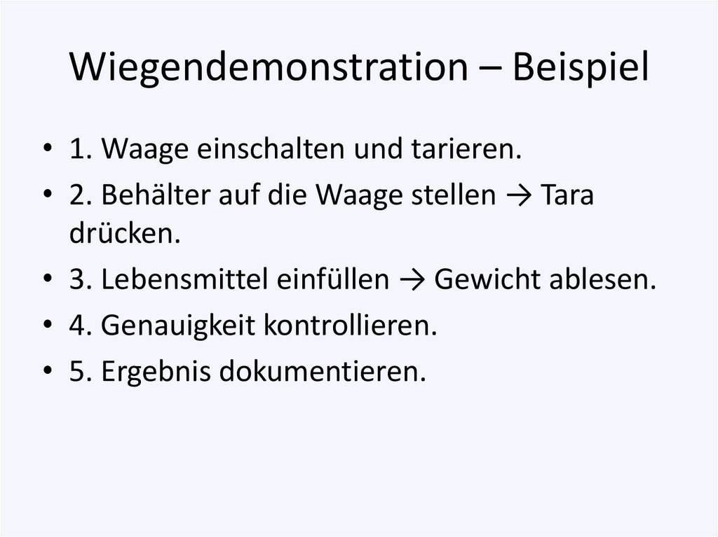 Wiegendemonstration – Beispiel• 1. Waage einschalten und tarieren.