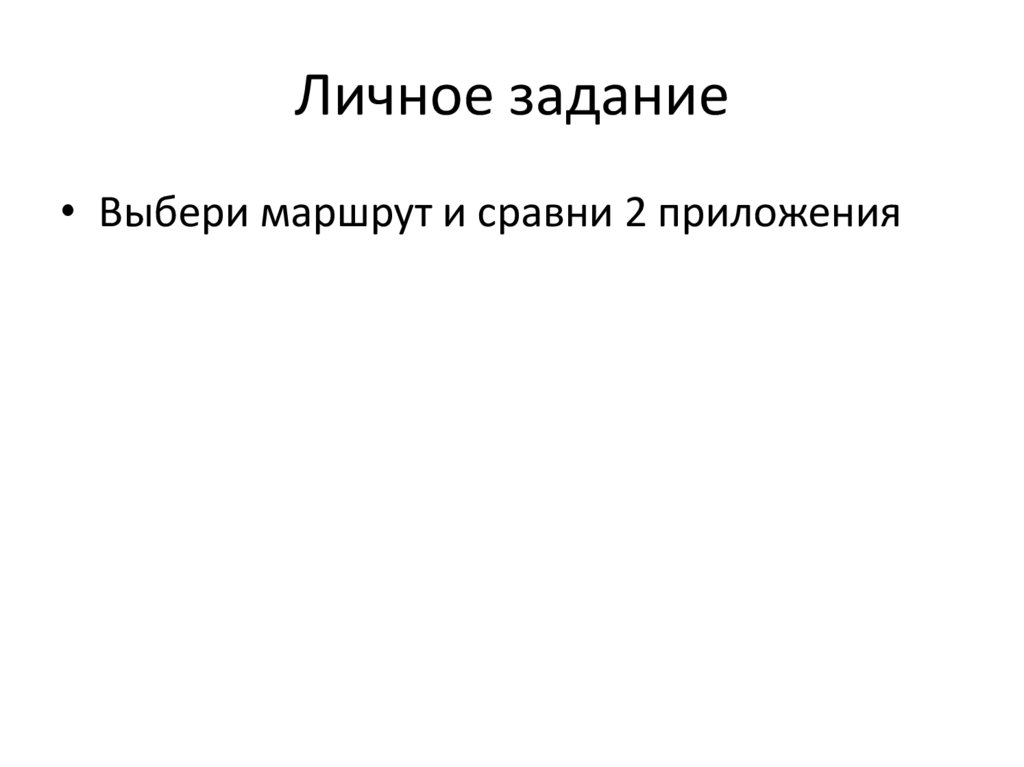 Личное задание• Выбери маршрут и сравни 2 приложения
