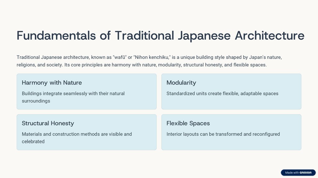 religions, and society. Its core principles are harmony with nature, modularity, structural honesty, and flexible spaces.