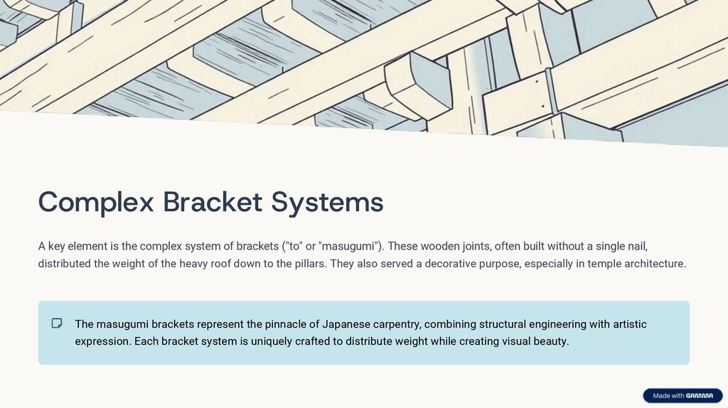 Complex Bracket SystemsA key element is the complex system of brackets ("to" or "masugumi"). These wooden joints, often built without a single nail,