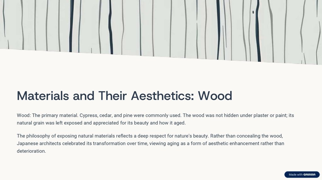 Materials and Their Aesthetics: WoodWood: The primary material. Cypress, cedar, and pine were commonly used. The wood was not hidden under plaster or paint; its