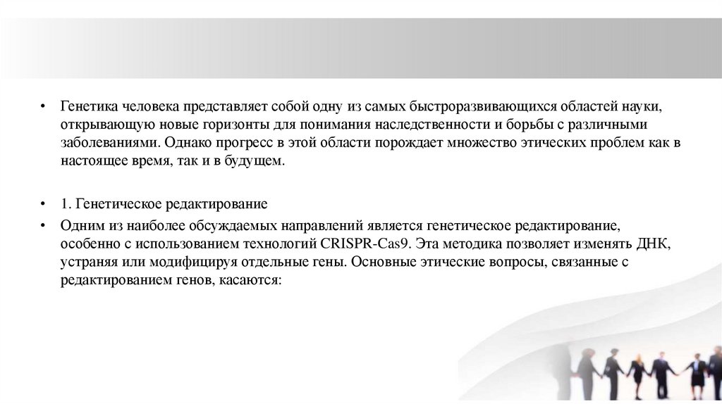 устраняя или модифицируя отдельные гены. Основные этические вопросы, связанные с