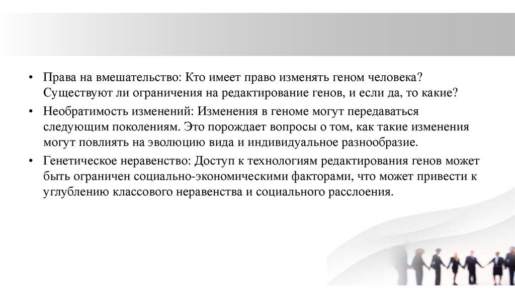 • Права на вмешательство: Кто имеет право изменять геном человека?Существуют ли ограничения на редактирование генов, и если да, то какие?