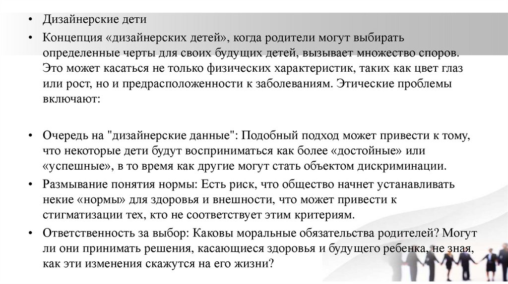 • Дизайнерские дети• Концепция «дизайнерских детей», когда родители могут выбирать