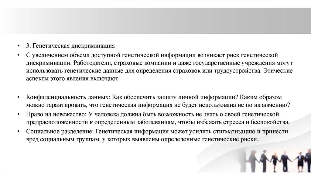• 3. Генетическая дискриминация• С увеличением объема доступной генетической информации возникает риск генетической