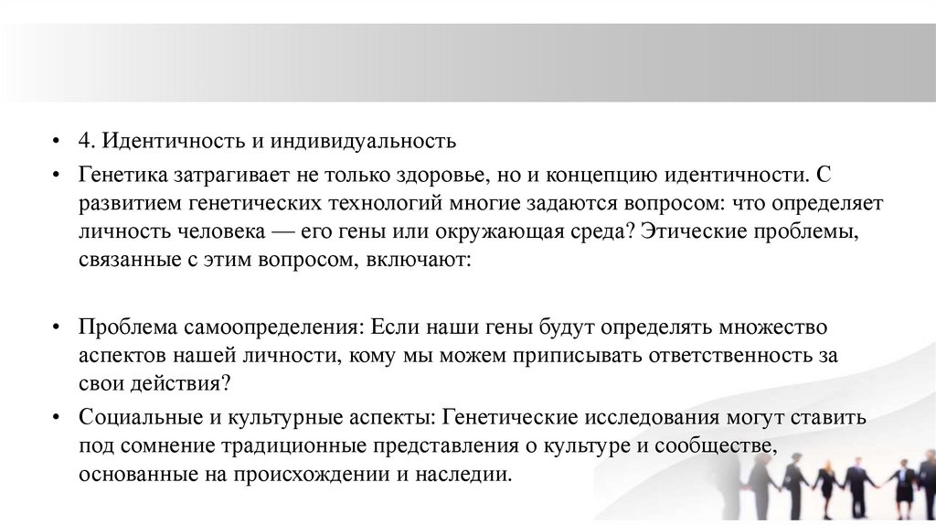 • 4. Идентичность и индивидуальность• Генетика затрагивает не только здоровье, но и концепцию идентичности. С