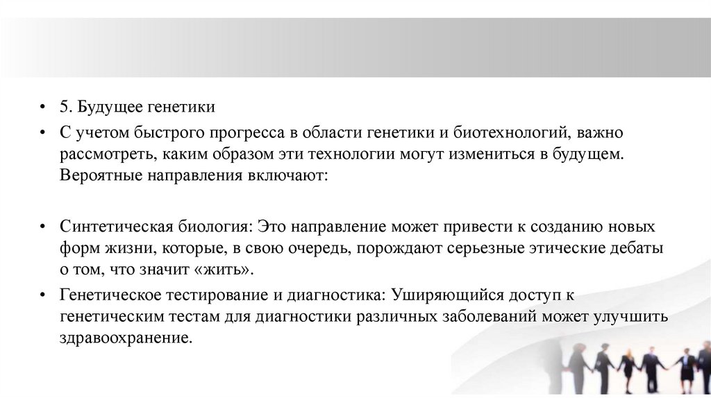 • 5. Будущее генетики• С учетом быстрого прогресса в области генетики и биотехнологий, важно