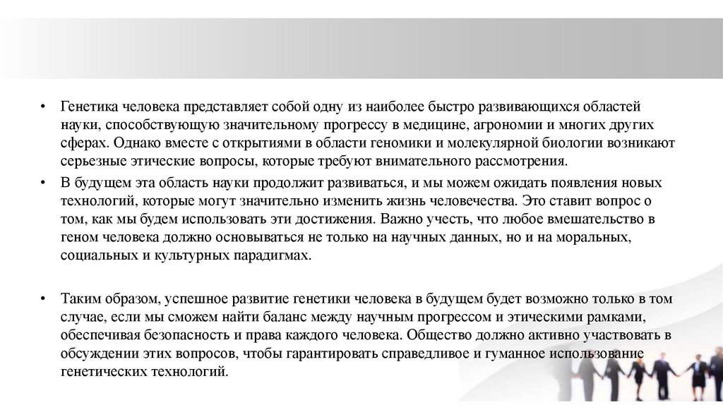 • Таким образом, успешное развитие генетики человека в будущем будет возможно только в том