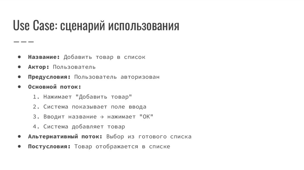 Use Case: сценарий использованияНазвание: Добавить товар в список