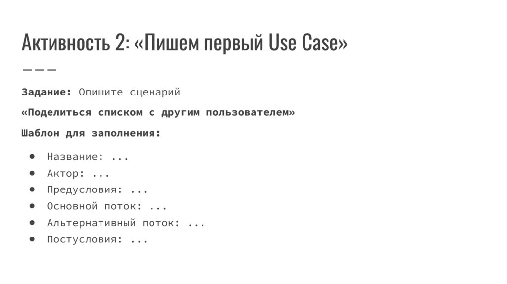 Активность 2: «Пишем первый Use Case»Задание: Опишите сценарий