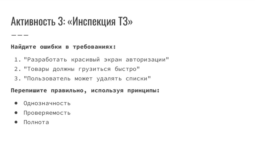Активность 3: «Инспекция ТЗ»Найдите ошибки в требованиях:
