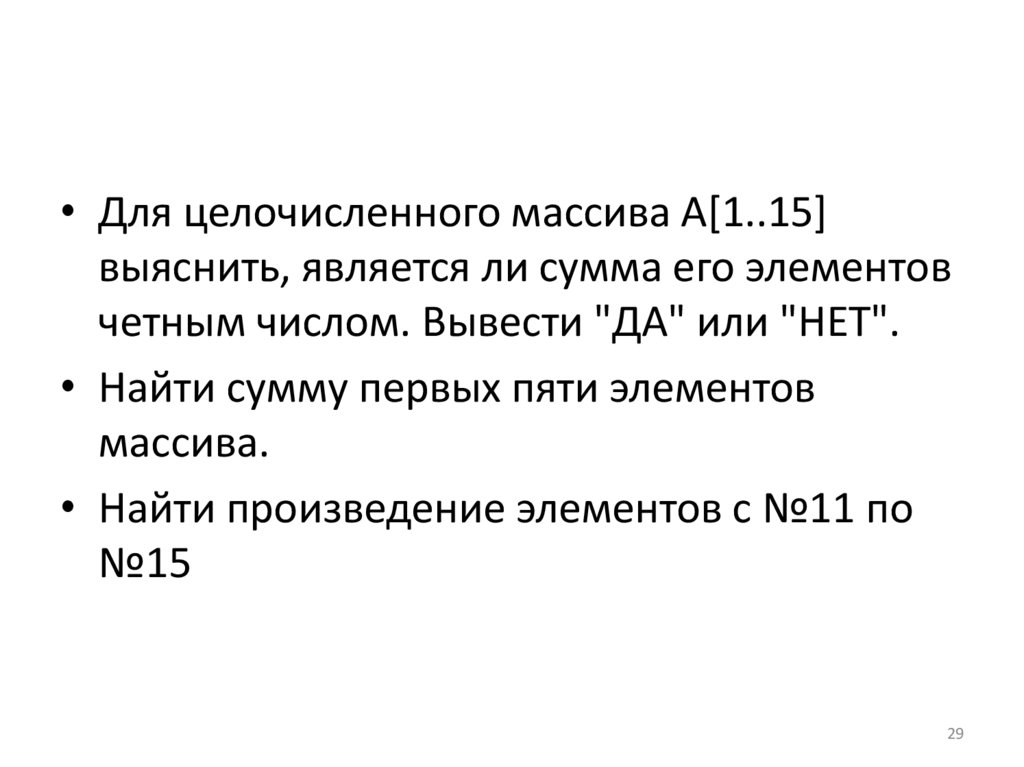 • Для целочисленного массива A[1..15]выяснить, является ли сумма его элементов