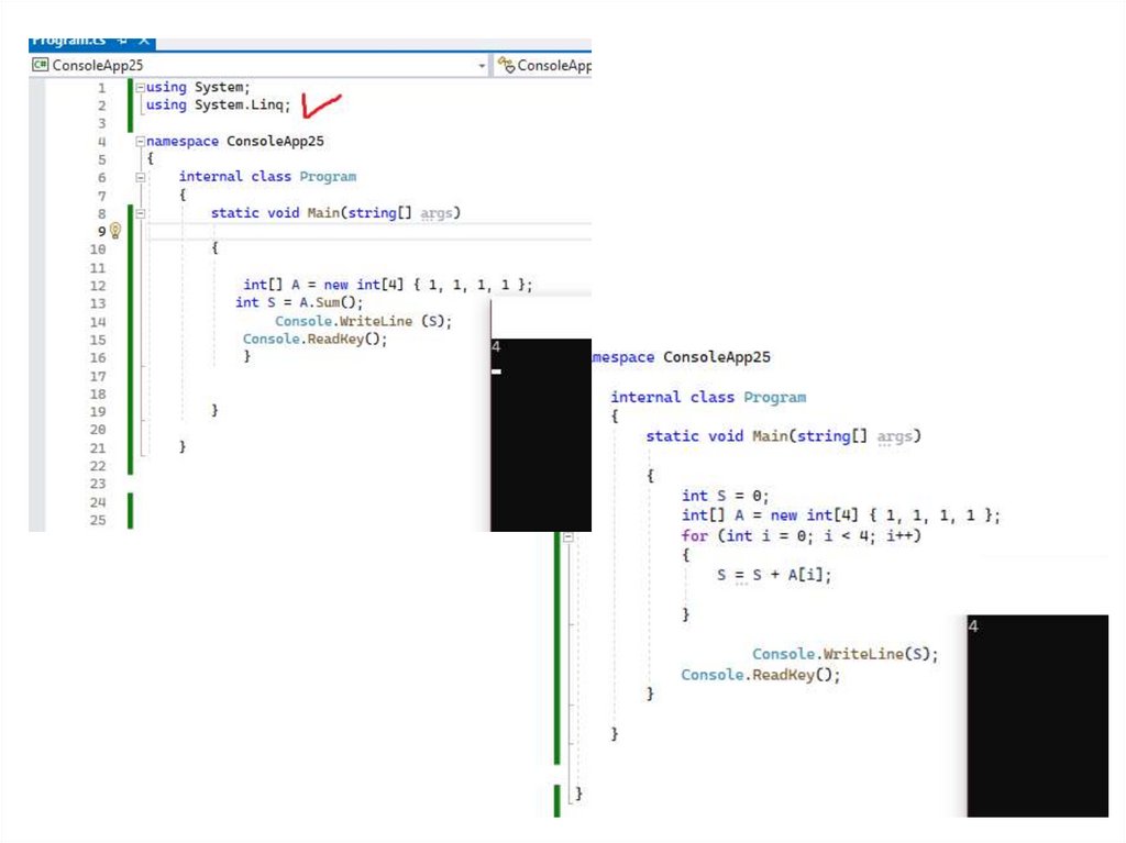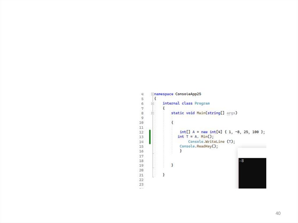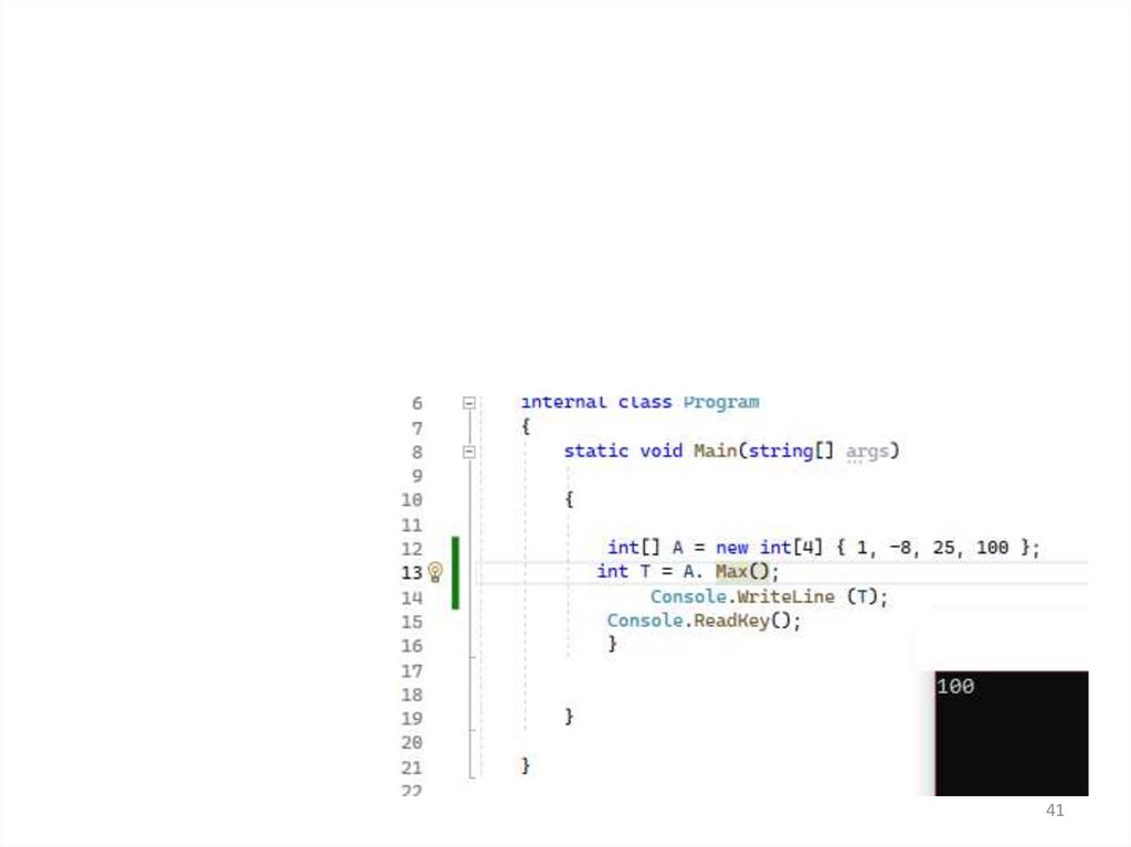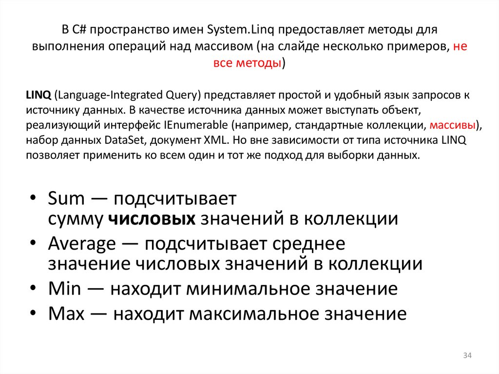 В C# пространство имен System.Linq предоставляет методы длявыполнения операций над массивом (на слайде несколько примеров, не