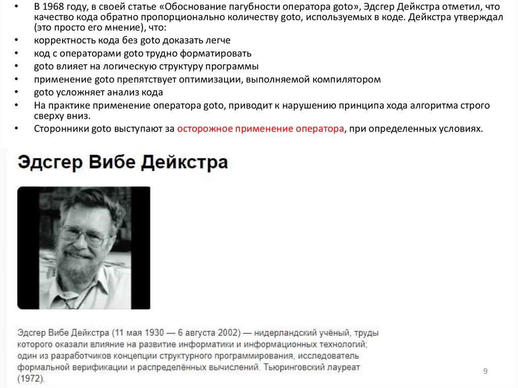 На практике применение оператора goto, приводит к нарушению принципа хода алгоритма строго