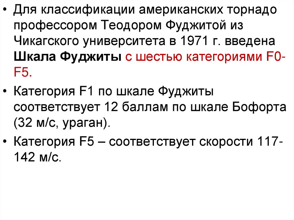 • Для классификации американских торнадопрофессором Теодором Фуджитой из