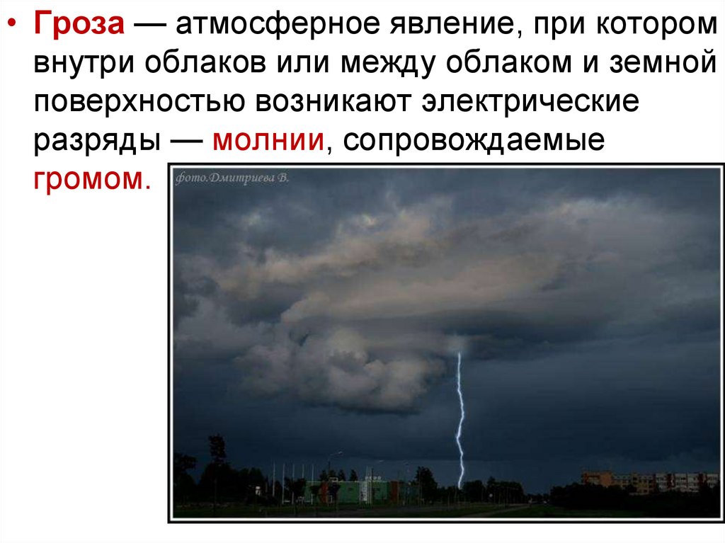 • Гроза — атмосферное явление, при которомвнутри облаков или между облаком и земной