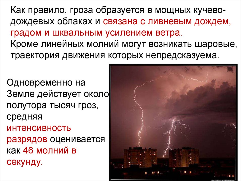 Как правило, гроза образуется в мощных кучеводождевых облаках и связана с ливневым дождем,градом и шквальным усилением ветра.