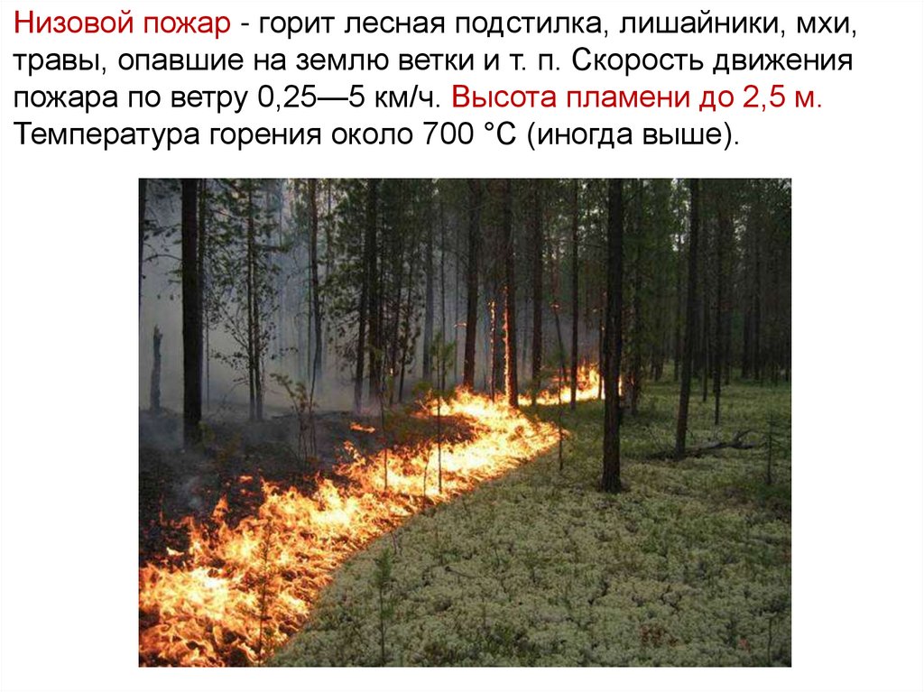 Низовой пожар - горит лесная подстилка, лишайники, мхи,травы, опавшие на землю ветки и т. п. Скорость движения
