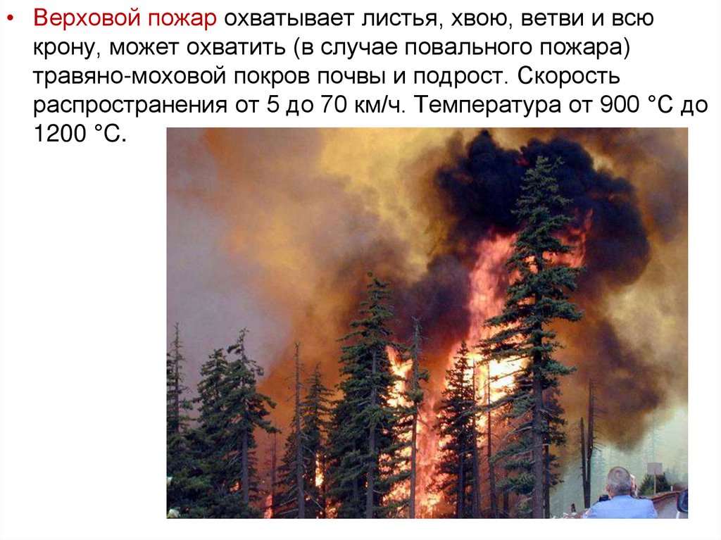 • Верховой пожар охватывает листья, хвою, ветви и всюкрону, может охватить (в случае повального пожара)