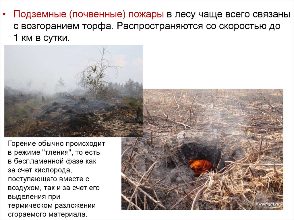 • Подземные (почвенные) пожары в лесу чаще всего связаныс возгоранием торфа. Распространяются со скоростью до