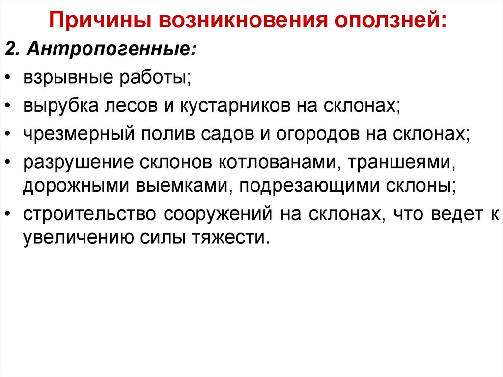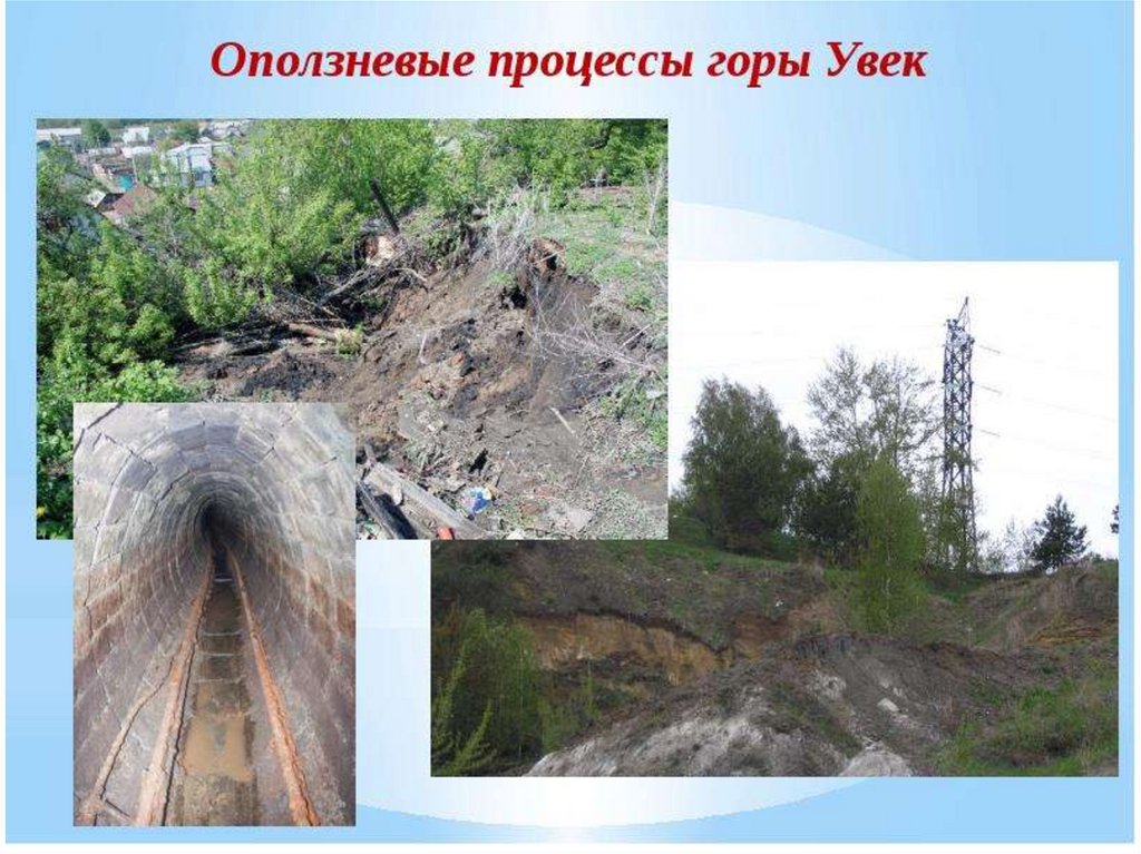 оползни; сели; обвалы, осыпи; лавины; склонный смыв; просадка лессовых