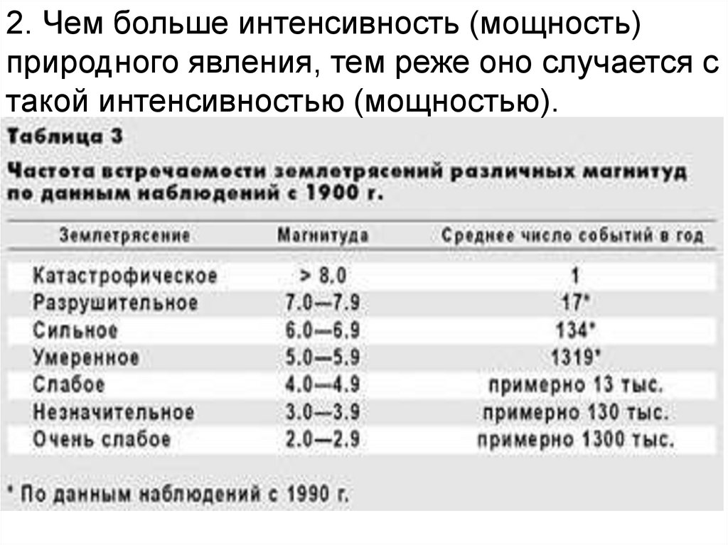 2. Чем больше интенсивность (мощность)природного явления, тем реже оно случается с