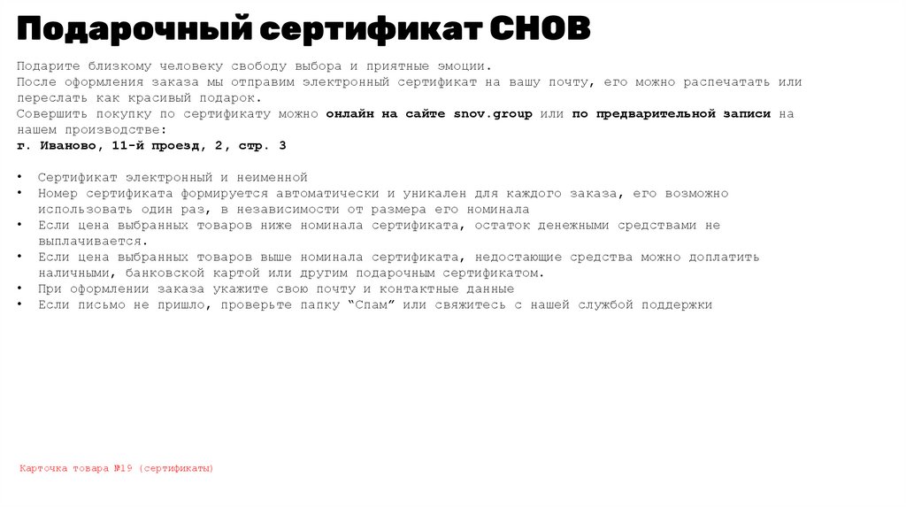 Совершить покупку по сертификату можно онлайн на сайте snov.group или по предварительной записи на