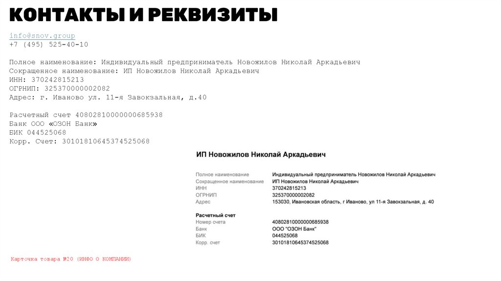 КОНТАКТЫ И РЕКВИЗИТЫinfo@snov.group